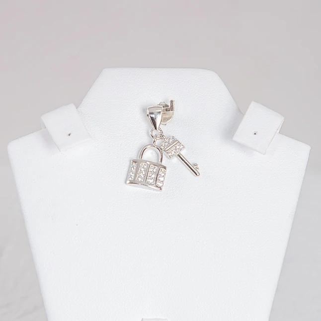 Dije en Plata de Ley 925, pulido, con baño de Rodio (no contiene Niquel), que asemeja a una terminaciòn en oro blanco. Engastes en finos zircones Suizos 5a que por su corte, brillo y dureza hacen una piedra exclusiva.
