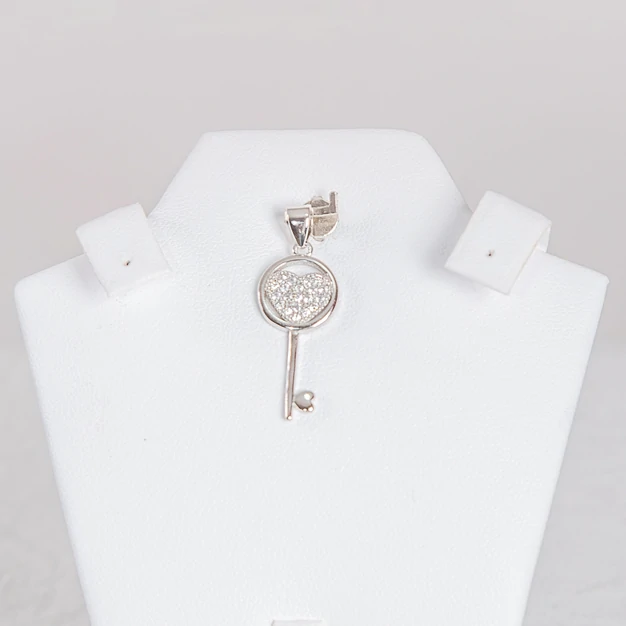 Dije en Plata de Ley 925, pulido, con baño de Rodio (no contiene Niquel), que asemeja a una terminaciòn en oro blanco. Engastes en finos zircones Suizos 5a que por su corte, brillo y dureza hacen una piedra exclusiva.